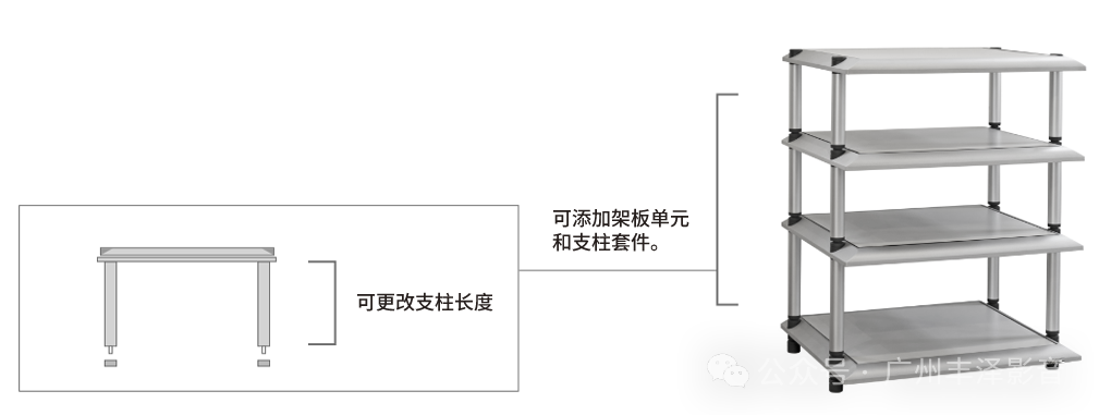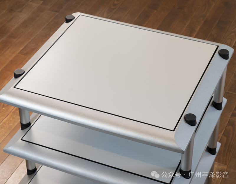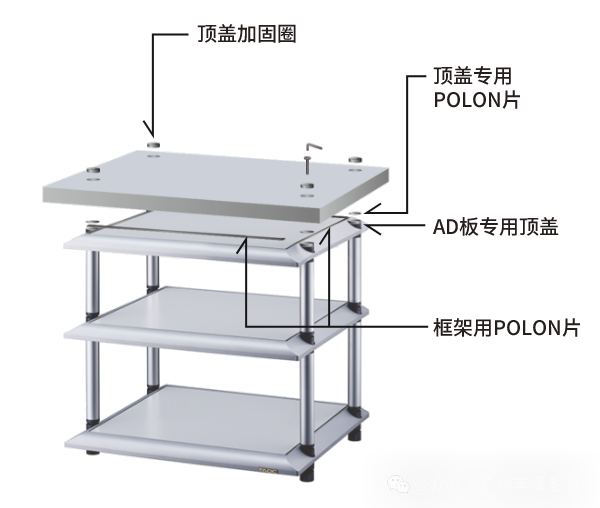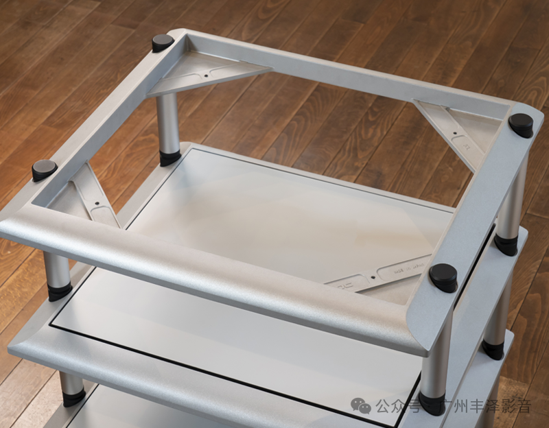3. 每条支柱与框架之间用上新设计的避震环,支柱下层的连接位选用新研发的铸铁制防震套件,以上钉下底碟形式将谐振降低外,能确保震动不会经支柱传递到其它层板。新款的柱子结构,加强巩固性外,更采用抱光圆柱型打磨外观,与机架外型更加衬托,秉承音响美学的设计理念。